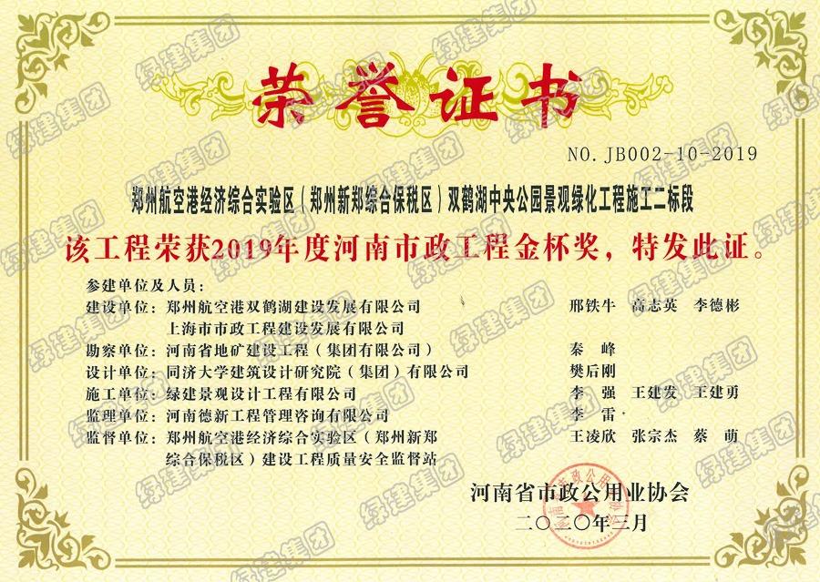 雙鶴湖二標(biāo)榮獲2019年度河南市政工程金杯獎